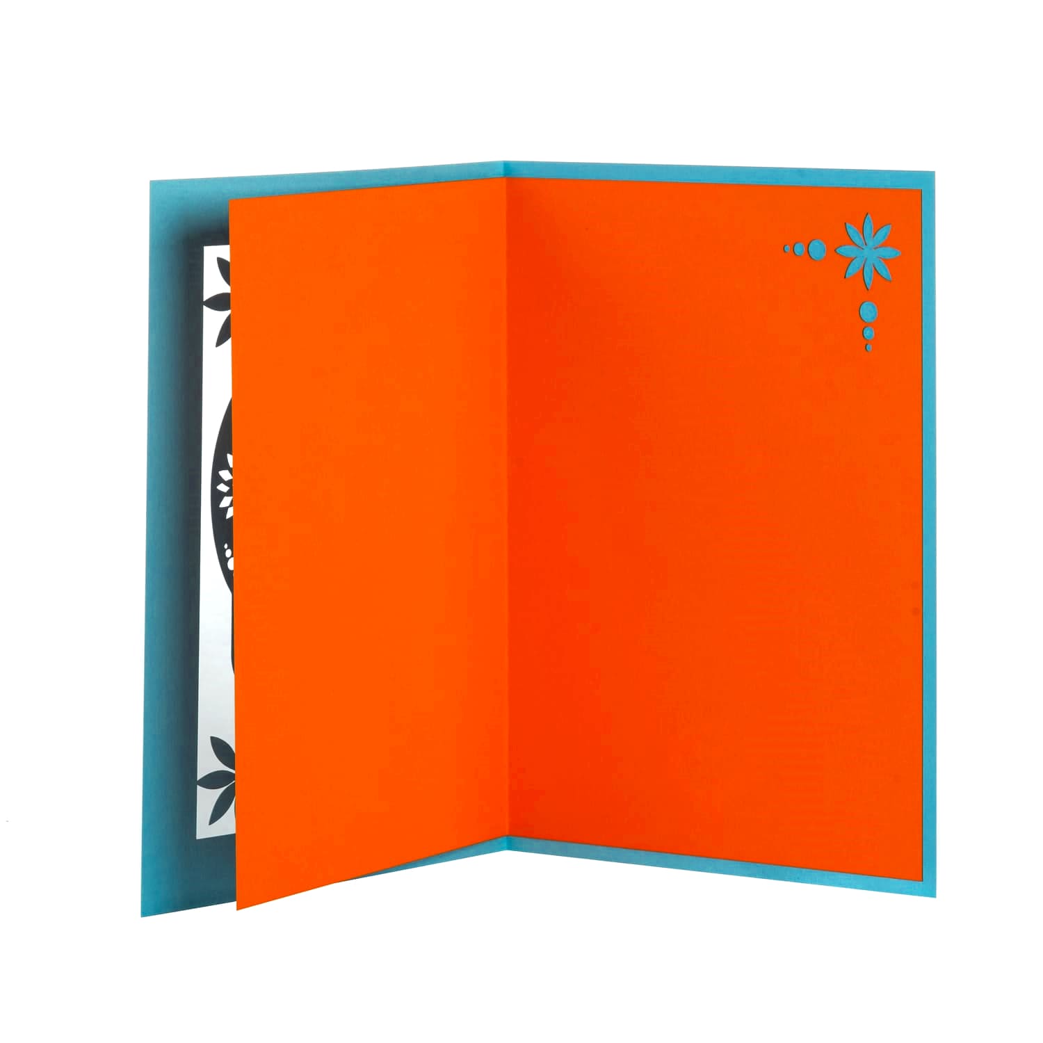 Postal azul turquesa cortado a laser representando uma caveira mexicana.